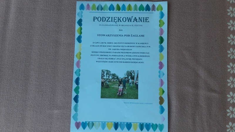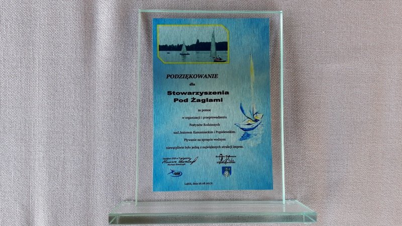 W dniu 26.08.2017r., podczas pikniku rodzinnego w Lubiniu nasze stowarzyszenie otrzymało specjalne podziękowania za zaangażowanie w organizacji festynów rodzinnych nad jeziorem Popielewskim i Kamienieckim przez Burmistrza Trzemeszna. Takie podziękowanie dla naszego stowarzyszenia ma szczególne znaczenie, gdyż podczas festynów nad jeziorem Kamienieckim i Popielowskim dostarczamy niezwykłych wrażeń podczas żeglowania dla mieszkańców miasta i gminy Trzemeszno, co stanowi niewątpliwie jedną z największych atrakcji imprez. Ponadto podczas festynu nad jeziorem Kamienieckim nasze stowarzyszenie uczestniczyło w zbiórce na podjazd wózka inwalidzkiego dla Natalki, za które również otrzymaliśmy indywidualne podziękowanie. Jest to dla nas ogromny zaszczyt. Nasze stowarzyszenie w swojej działalności bardzo promuje przedsięwzięcia mające na celu m.in. niesienie pomocy dla osób potrzebujących, a także chcących aktywnie spędzać wolny czas nad naszymi jeziorami.