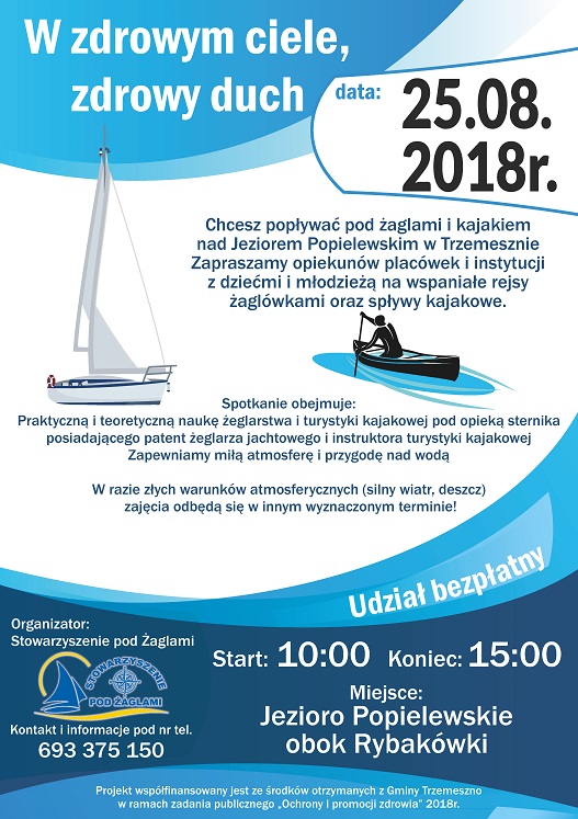 Stowarzyszenie Pod Żaglami w dniu 25.08.2018r. zaprasza miłośników turystyki wodnej do udziału w projekcie pozwalającym poznać tajniki żeglarstwa i kajakarstwa. |