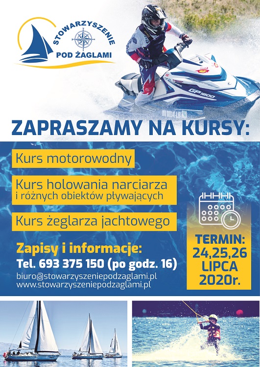 Stowarzyszenie Pod Żaglami zaprasza miłośników sportów wodnych na kurs sternika motorowodnego i żeglarza jachtowego. Organizacja kursów uzalezniona od ilości uczestników. Terminy i zapisy pod tel. 693375150 - po godz. 16,00