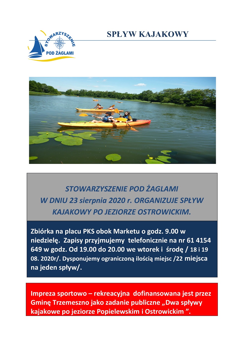 W dniu 17.07.2020 r. Stowarzyszenie pod Żaglami zorganizowało spływ kajakowy po jeziorze Popielewskim w Trzemesznie dla sympatyków kajakarstwa i turystyki aktywnej. Przed rozpoczęciem spływu instruktorzy przeprowadzili instruktaż z podstawowych zasad bezpieczeństwa nad wodą, omówiono trasę spływu i przeprowadzono rozgrzewkę, po której udaliśmy się na spływ kajakowy. Podczas spływu dopisywała nam wspaniała pogoda i miła atmosfera, również mogliśmy podziwiać walory przyrodnicze naszego jeziora. Na zakończenie spływu zorganizowaliśmy ognisko przy którym piekliśmy kiełbaski i wspominaliśmy przeżyte chwile podczas spływu kajakowego.