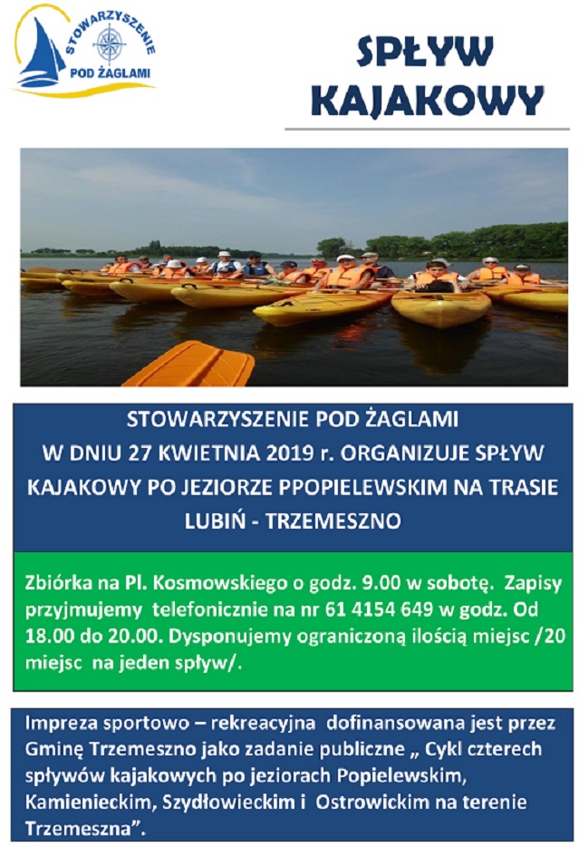 Storarzysznie pod żaglami zaprasza miłośników kajakarstwa na pierwszy spływ kajakowy z cyklu spływów po jeziorach gminy Trzemeszno finansowany z środków publicznych. |