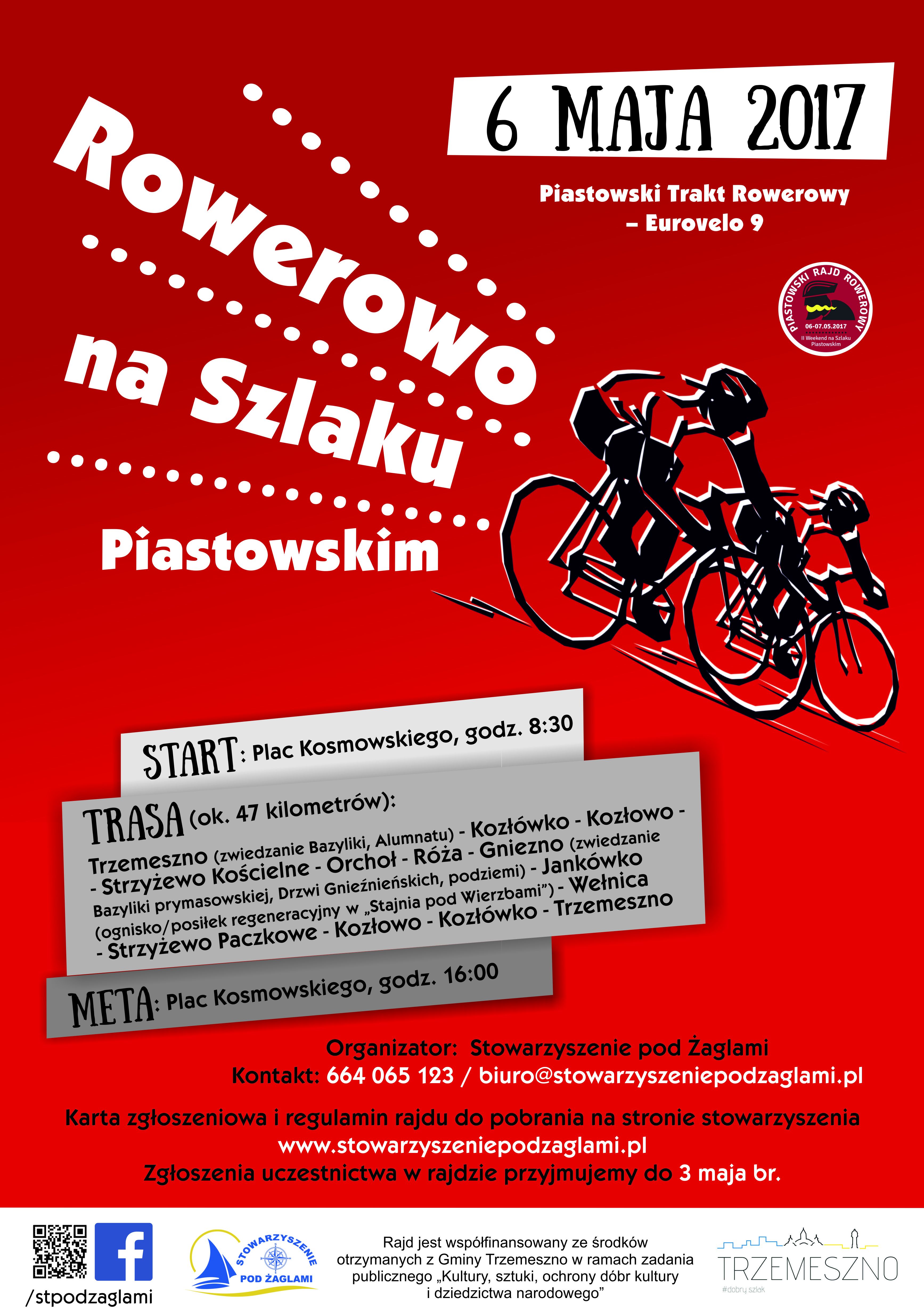 W dniu 13 maja br. nasze stowarzyszenie organizuje Rajd rowerowy "Rowerowo na Szlaku Piastowskim"  z Trzemeszna do Gniezna. Rajd jest organizowany w ramach II Weekendu na Szlaku Piastowskim oraz w ramach dotacji otrzymanej z Gminy Trzemeszno w ramach zadania publicznego pn.:"Rajd rowerowy z historią w tle". Rajd rozpoczniemy o godz. 9.30 w Trzemesznie na pl. Kosmowskiego, gdzie zostaną omówione zasady bezpieczeństwa i przebieg trasy. Następnie uczestnicy będą mieli okazję poznać historię Bazyliki pw. Wniebowzięcia Najświętszej Maryi Panny w Trzemesznie, która została wybudowana w stylu barokowym, z widocznymi pozostałościami stylu romańskiego (kolumny z XII w.) i gotyckiego w zachodniej części.