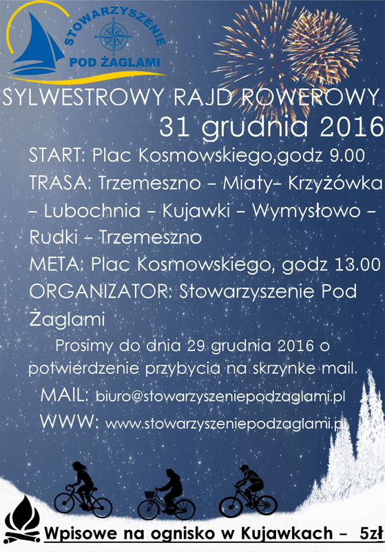 W dniu 31 grudnia 2016 r. pomimo niewielkiego przymrozku wyruszyliśmy w I Sylwestrowy Rajd Rowerowy, który wiódł trasą: Trzemeszno – Miaty – Krzyżówka – Lubochnia - Kujawki – Wymysłowo – Rudki - Trzemeszno. Zanim ruszyliśmy odbyła się odprawa na której omówiono zasady bezpieczeństwa i przedstawiono trasę. Pomimo niewielkiej usterki roweru jaki przydarzył się jednemu z uczestników rajdu ruszyliśmy kilka minut po godzinie 09.00.