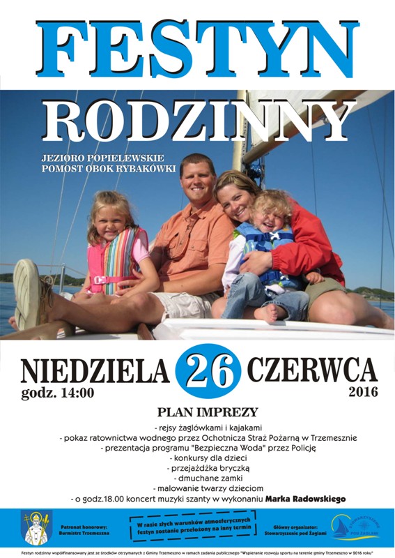 W dniu 26 czerwca br. zorganizowaliśmy Festyn Rodzinny nad Jeziorem Popielewskim w Trzemesznie. Po oficjalnym rozpoczęciu festynu odbyła się parada jednostek, które na co dzień pływają po naszym akwenie. Po uroczystej paradzie odbyły się regaty jachtów żaglowych, gdzie zgromadzeni uczestnicy mogli podziwiać zmagania sterników. Następnie osoby, które przybyły na festyn mogły skorzystać z darmowych rejsów na jachtach żaglowych i motorowodnych. Ponadto dla najmłodszych czekały inne atrakcje takie jak dmuchany zamek, malowanie twarzy czy przejażdżka bryczką. Dodatkową atrakcją było stoisko przygotowane przez Powiatową Komendę Policji z Gniezna, gdzie można było sobie zrobić zdjęcie z „Pyrkiem” czy założyć ochraniacze i kask.