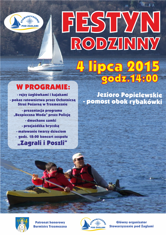 W dniu 4 lipca br. odbył się Festyn Rodzinny nad Jeziorem Popielewskim pod patronatem Burmistrza Miasta Trzemeszno, a zorganizowanym przez nasze stowarzyszenie. W czasie festynu uczestnicy mogli bezpłatnie popływać jachtami żaglowymi natomiast Ośrodek Sportu i Rekreacji w Trzemesznie użyczył swoich kajaków i rowerków wodnych. Dużym zainteresowaniem cieszyła się przejażdżka bryczką. Dzieci mogły skorzystać z zabawy na dmuchanych zamkach czy malowania twarzy.